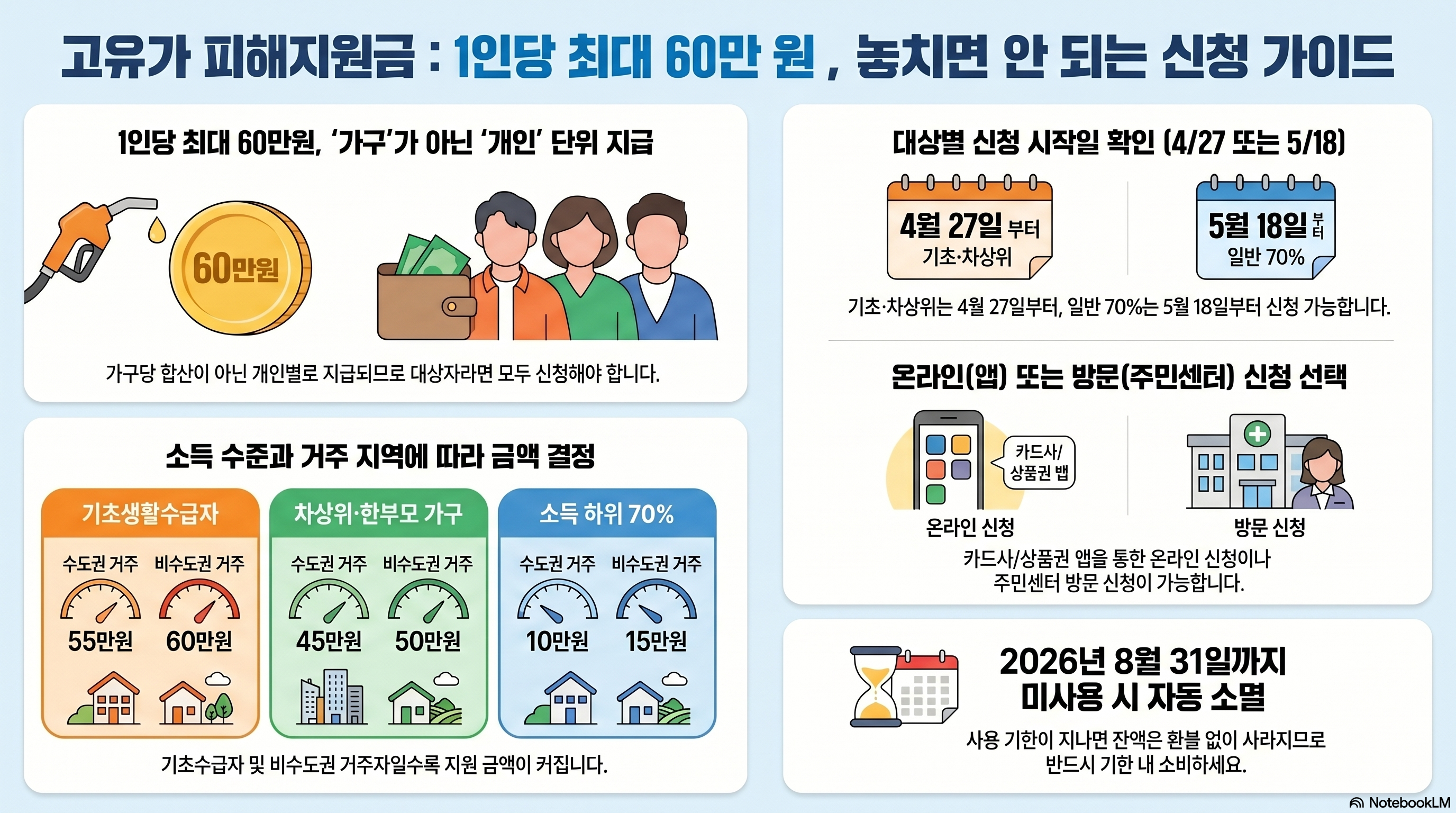 고유가 피해지원금 신청이 시작됐습니다. 1인당 최대 60만 원이지만 신청기간을 놓치면 받을 수 없습니다. 기초수급자·차상위·한부모는 4월 27일, 소득 하위 70% 국민은5월 18일부터 신청 가능합니다. 아래에 금액 기준·신청방법·사용처·사용기한까지 한 번에 정리했습니다. 내용 확인하시고 꼭 늦지 않게 신청하세요