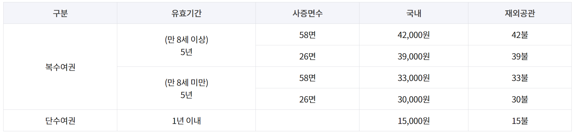 단수여권: 1회용 여권으로 특정 나라 왕복 1회만 사용가능합니다.