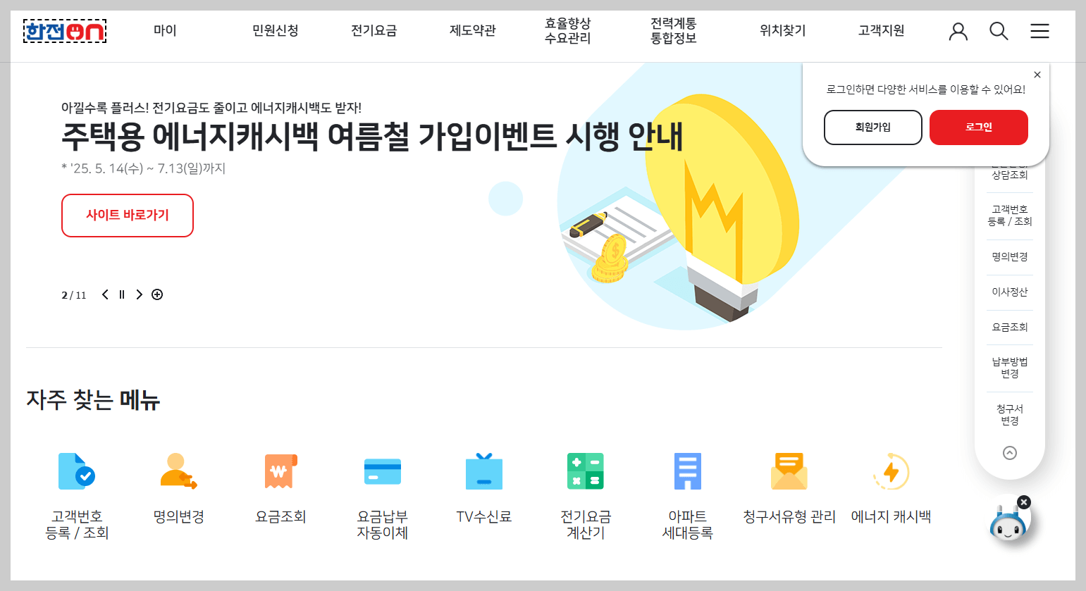 - 한전 사이버 지점 홈페이지에 접속합니다.