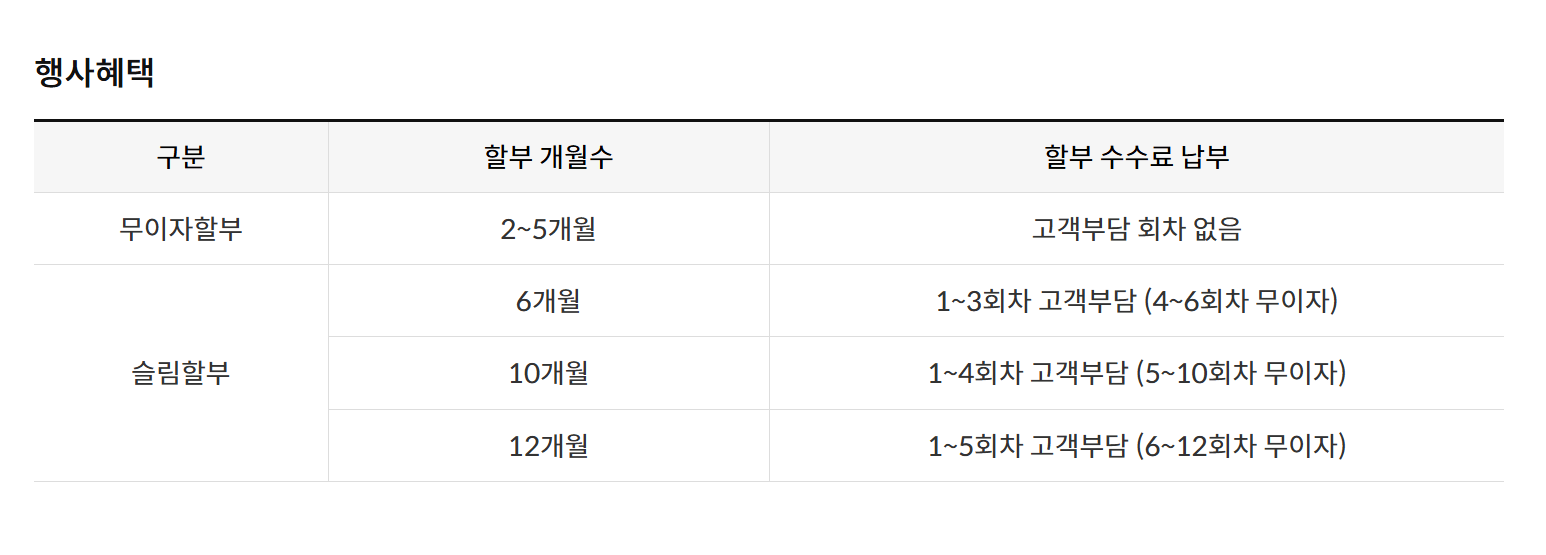 일부 슬림할부(부분 무이자)는 초기 몇 회차에 이자가 발생할 수 있으므로 총 납부 금액을 미리 확인하는 것이 좋습니다.